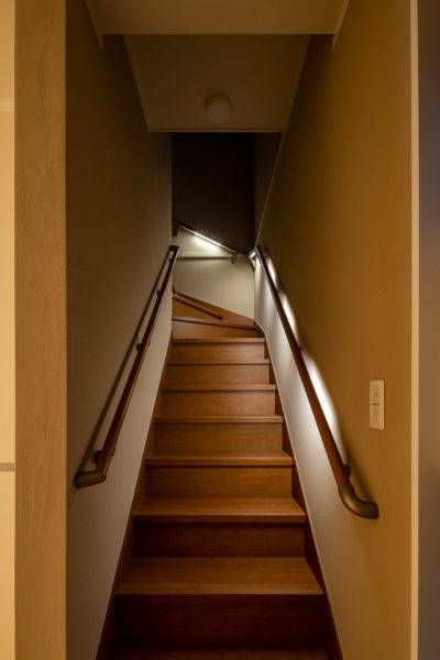 昇降がしやすいように、踏み面を広く、蹴上を低く、緩勾配にしました。夜に手元・足元を広範囲にやわらかく照らすLED照明付き手摺を設置しました。