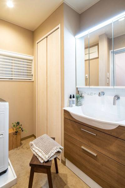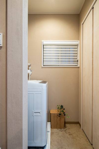 通路のような空間の一角にあった壁掛洗面器から、コンパクトながらも洗面化粧台、洗濯機、収納を配置した洗面室をキッチンの近くにレイアウトして家事動線を劇的にアップさせました。