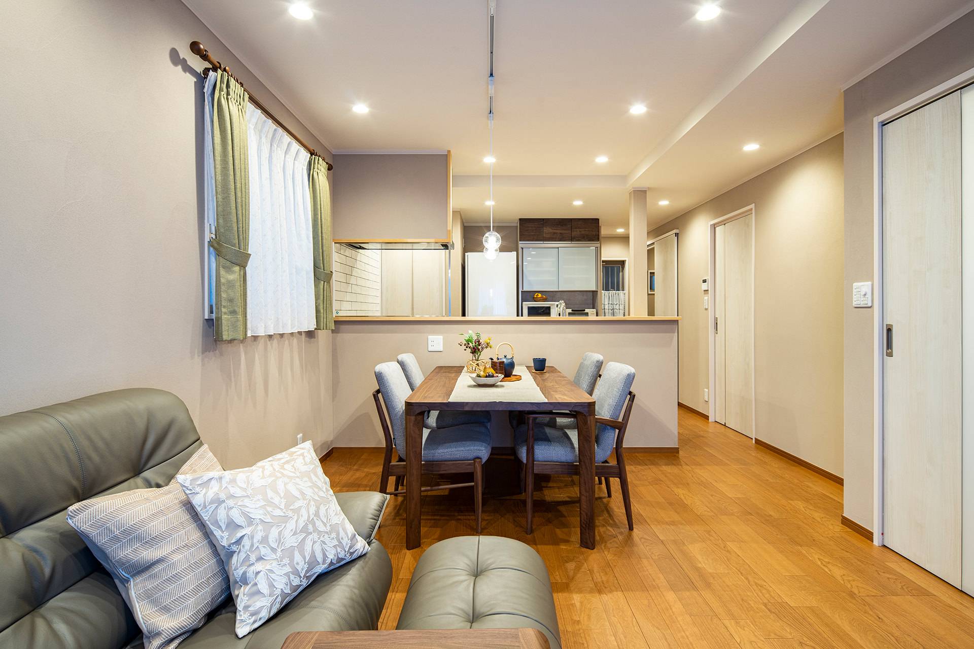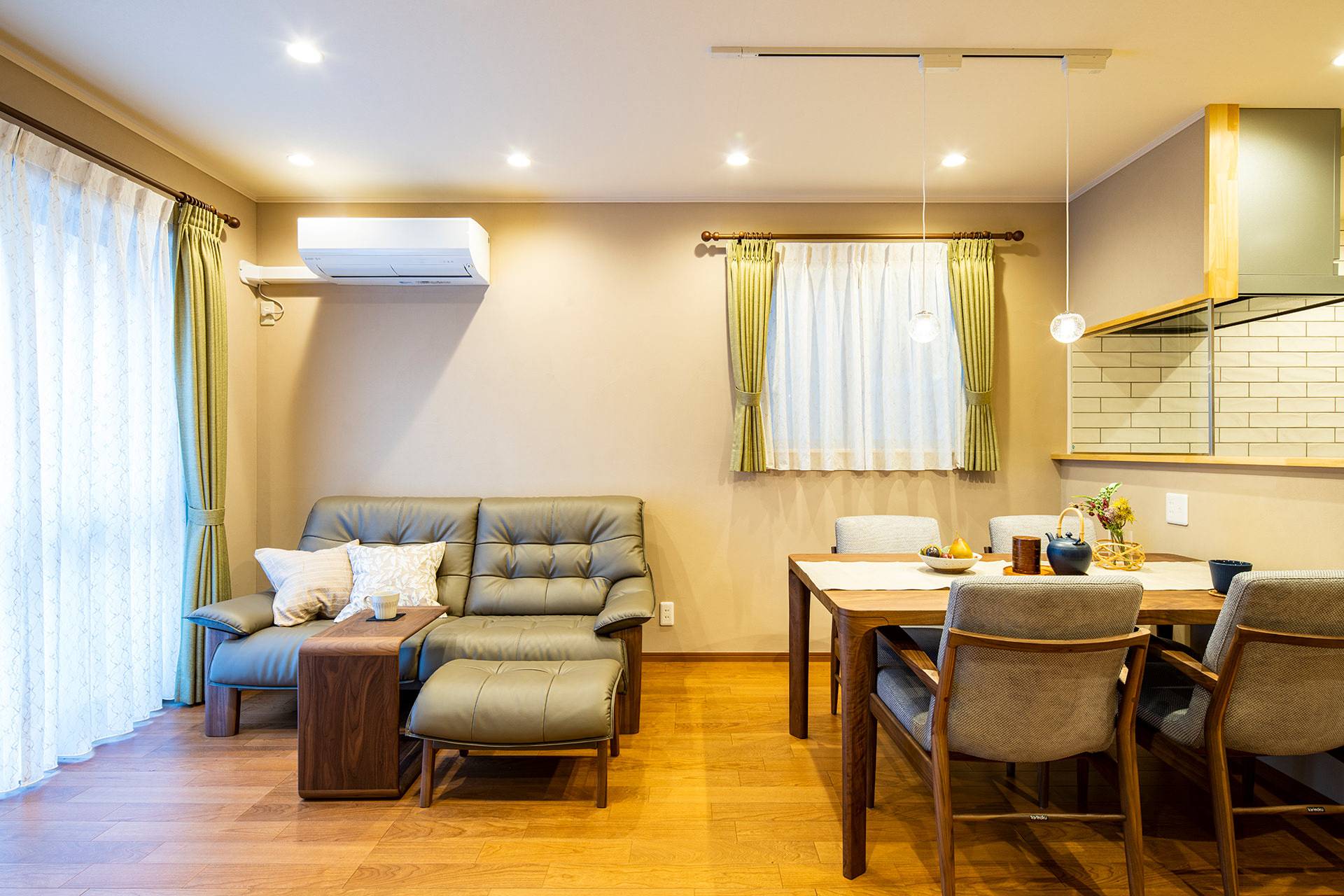 将来のことも考えてキッチン内は広めにしました。ソファ、ダイニングセット、TVボードはカリモク家具で揃え内装に合わせて落ち着いた雰囲気に。