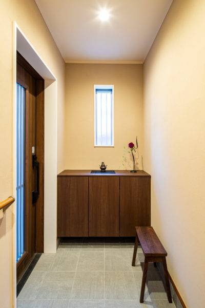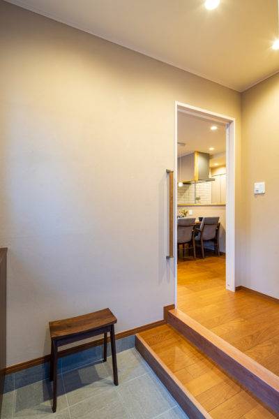 奥まっていた玄関を建物の手前に移動させ出入りもしやすくしました。 窓を設けて明るくゆったりとした空間にし、上がり框の前に一段ステップを設け動作をしやすくしました。