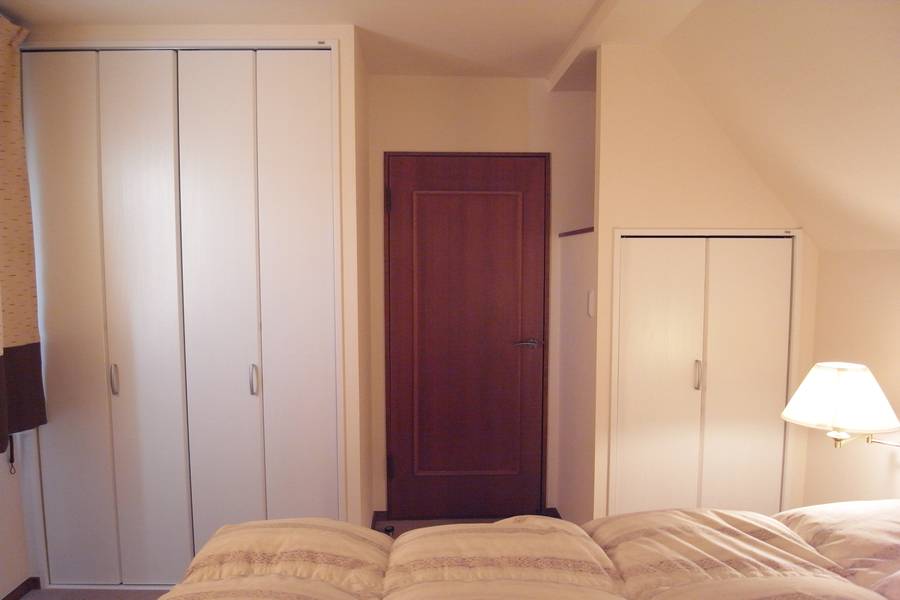 クローゼットがあったものの収納量はいまひとつ・・・そこで、傾斜壁側にベッドヘッドがくるレイアウトに変更。寝転べば目線の位置も低くなり、斜めの壁も気になりません。 ベッドサイドにはホテルライクな壁付け照明を設置しました。調光スイッチにより明かりをコントロールできるため、快適な睡眠へと導けるようになりました。クローゼットは、上部の棚までしっかり置けて取り出しやすくしました。