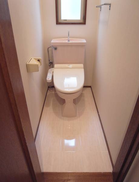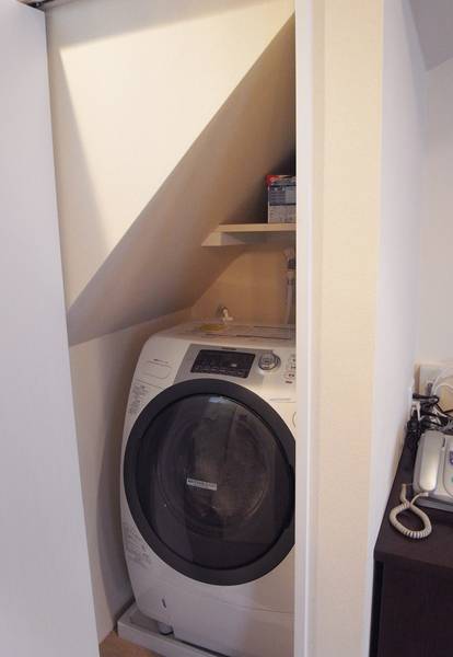 洗濯機置き場が室内になかった住宅でした。洗面室にも置くスペースがないということで、キッチン脇の階段下を利用して洗濯機置き場に。ドラム式限定ですが・・キッチンとも近く、動線もスムーズです。トイレの床はタイル貼りでエレガントに。