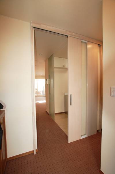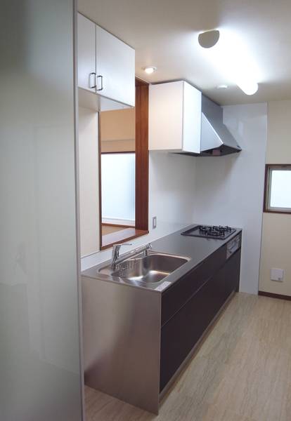 LDKの入口を玄関側に移動させ、元々の廊下を部屋に取り込み、キッチンへのアプローチもスムーズにしました。冷蔵庫脇の間仕切りは強化ガラス。光が通って明るくなりますが、実は少しでも大きなサイズのキッチンを入れるために間仕切壁を薄くしたかったのが目的です。