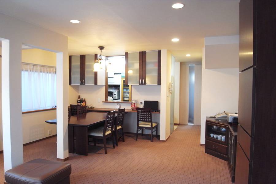 オープンキッチンが奥様の希望でしたが、筋交いがある壁に挟まれていたため、元々キッチンの入口だった開口部の腰下を塞いで、キッチンとダイニングルームを結ぶ窓に見立てました。独立型のキッチンでありながら、リビングダイニングルームとコミュニケーションが取れるようになっています。 ダイニングテーブルの頭上のペンダントは、奥様がキッチンから見る眺めが心温まるようなデザインをご提案しました。