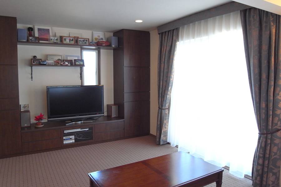 中古住宅を購入され、スペースの活用方法などを整理しながら、これまで大切に使われていたクラシックな家具とのコーディネートで落ち着きのあるインテリアに仕上げました。お持ちのエレガントなカーテンも再利用しながら、新しい空間を引き立てる重厚感たっぷりなクラシックなカーテンを追加し、更にお気に入りの住まいに!