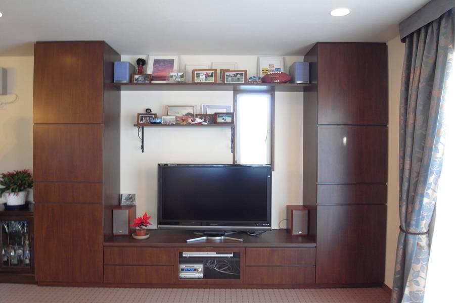 レコードプレーヤーやレコード、他にもリビングで溢れてしまう物をまとめて収納するために、テレビボードと一体型の収納キャビネットをオーダーメイドで製作しました。扉の面材は、お持ちのリビングテーブルとソファに合わせてコーディネート。飾り棚には写真がいっぱい!