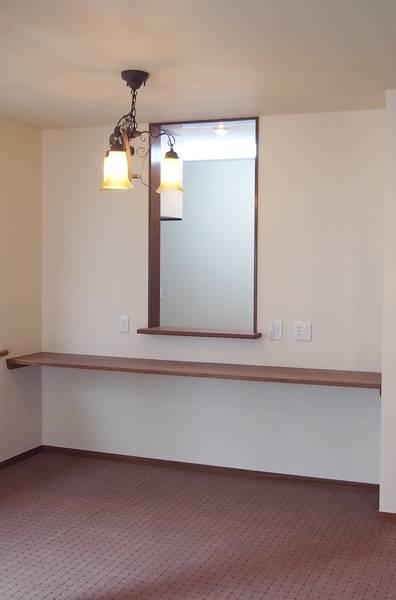 洋室をまるごとクローゼットルームに。お持ちの引出箪笥も置けるので、他のお部屋がスッキリしました。一角には、御主人の日常使いの小物を置ける壁面棚を設置。デスクも置いて、書斎コーナーとしても利用するそうです。