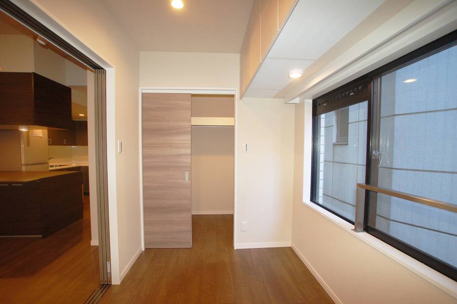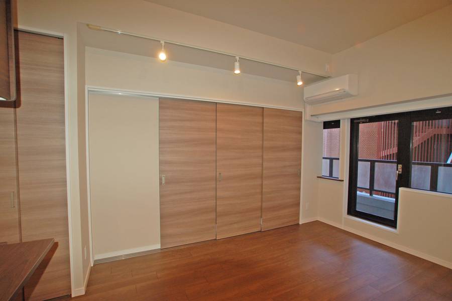 ちょっとだけ狭くなったベッドルームですが、セミダブルベッドを置いても通路が確保できるよう、間仕切りラインを決定しました。ベッド上部には一面収納の吊戸棚を設置。そして、元々押入だったところは一部スペースを広げてウォークインクローゼットをつくり、大容量の収納に。部屋が多少狭くなっても、収納スペースを広く取って片付くほうが、暮らしは快適ですよね。