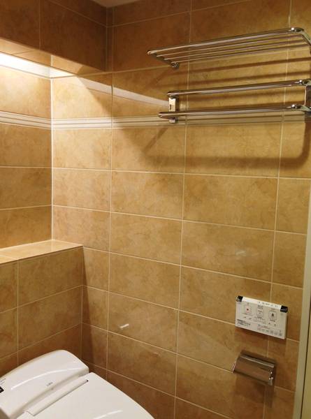 元々壁面に大きな収納があったため、次に使うバスタオルを置けるタオル棚とタオルハンガーを設置しました。これはホテルでも採用されているバスアクセサリーです。
