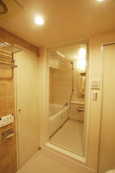 歴史を感じる洗面ボウルと便器を撤去し、全面タイル貼りのワンルームの空間に。脱衣室も兼ねています。洗面前にあるライニング(配管スペースで壁がふけているところ)はそのままに、ここを棚代わりに使えるよう工夫しました。間接照明を入れて、温かみのある空間に。