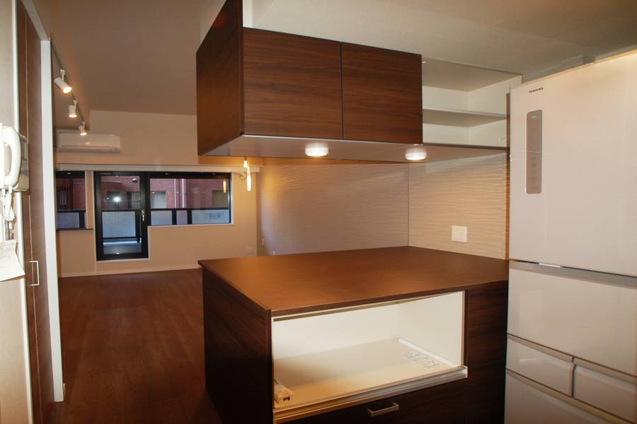 個室だったキッチンの壁を壊して、その部分に4つの機能が合体したコーナーをつくりました。