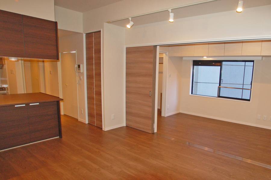 リビングルームにいることが多いため、できれば部屋を広げたい、というのが第一希望でした。そこで、間にあった壁を壊して、少しだけベッドルーム側に間仕切りラインを移動。お一人住まいなので、普段は3枚引戸を開け放して広々と使えるようにしました。来客がある時は、引戸を閉めてプライベートコーナーを隠します。