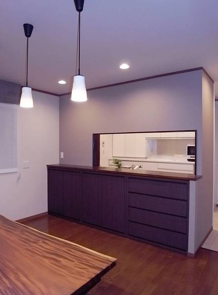 ここに6人家族がお食事や団欒に集うメインのお部屋です。ご家族が選ばれたダイナミックな無垢板の座卓テーブルにあわせて、和モダンなペンダントライトをセレクト。キッチンカウンターの下には、サイズがセミオーダー可能な収納家具を上手に組み合わせて、まるで造り付けのように一体感を出しました。書類や文房具など、ここで皆さんが使うものを奥様と一緒に整理して、棚がよいのか引出しが良いのかを決定しました。