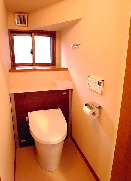 1階は、昔ながらの陶器タイルが壁に貼ってある在来式の浴室でした。今回は、床壁ともに既存のタイルの上に新しいタイルを重ね貼り。水栓やシャワーヘッド、ミラーやワイヤートレーも交換。浴槽はコーティング加工で新品同様に生まれ変わりました。トイレは、1階2階同様に手洗いコーナーを設けました。