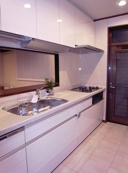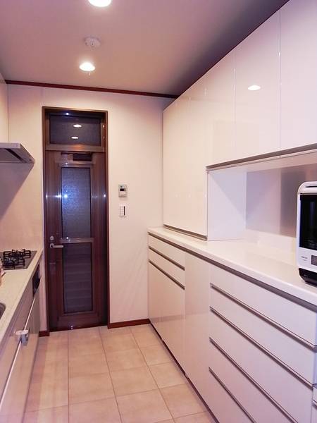 キッチンをリビングダイニングルーム側に向けるため位置を移動しました。この場合、配管等で床のフローリングを一部壊す必要があるため、どうせならばキッチンの床だけ全く違う素材で!と、メンテナンスがしやすいタイルをお薦めしました。元々キッチンがあった壁面側には大容量の収納を確保。設備、収納、タイル貼りの床と、新しい空間が生まれました。