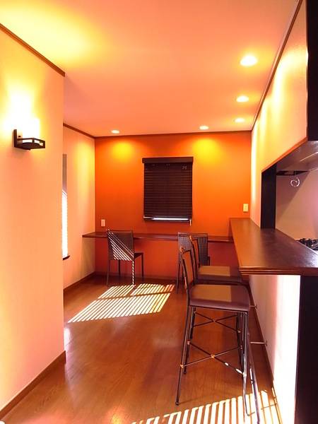 2階はご夫婦の希望でアジアンテイストに。元々壁に造り付けてあった味気ないホワイトのカウンターや、キッチン前のカウンターには、ダークブラウンの木目調メラミン化粧板を重ね貼りしました。カフェカウンターのように使っていただくイメージをチェアとともにご提案しました。壁面のタイルとブラケットライト、窓まわりのウッドブラインドとあわせてコーディネートしています。