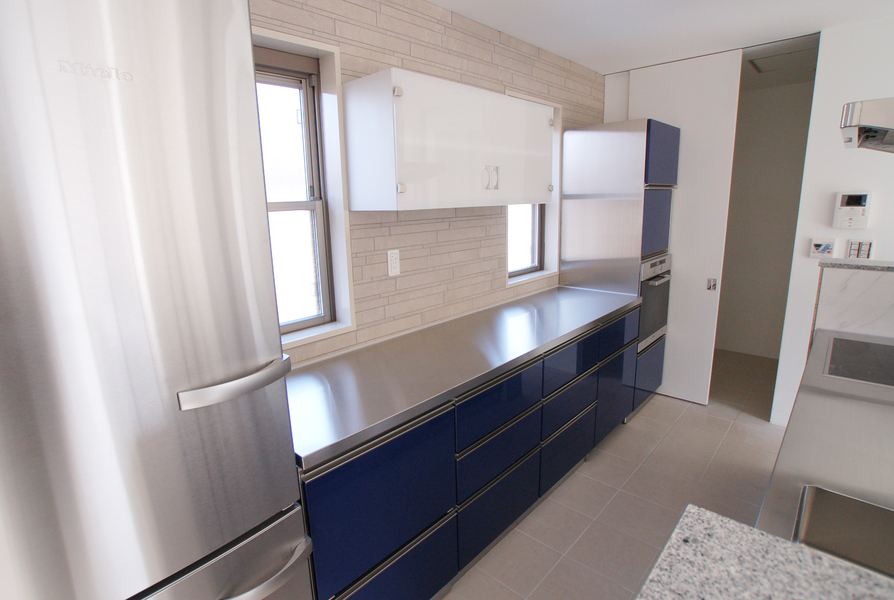 引出しは、色々と機能があるよりも逆にシンプルなほうが好きに収納できるからよい、とこちらも意思がはっきりとされていました。家電収納も、キャスター付きのゴミ箱も、お好きなブルーの扉で全て隠しました。キッチン水栓は、オープンキッチンだからこそデザインが目を引くタイプに。