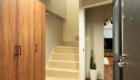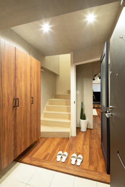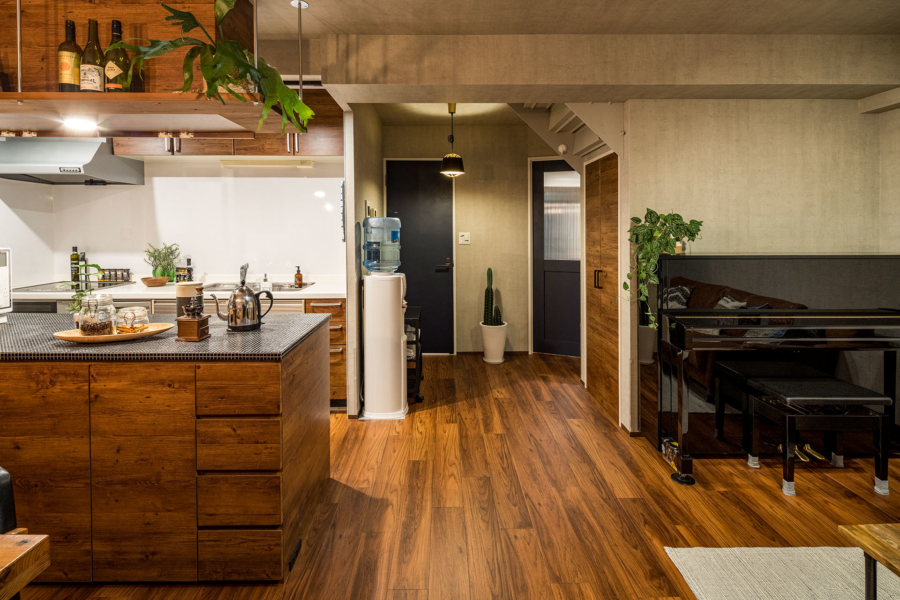 LDKの入口を玄関近くに移設して、廊下とLDKの間仕切壁を撤去しました。階段下にあった収納を削った分、使いやすいように収納扉の位置を変更。通路と収納だけだった廊下部分をLDKの空間に取り込みました。