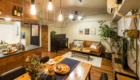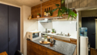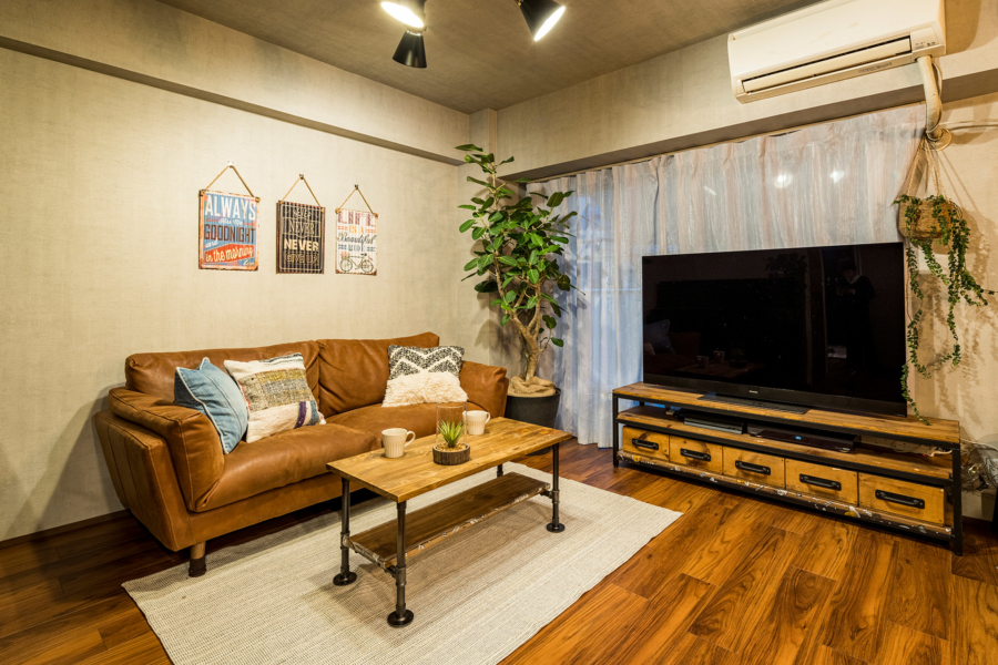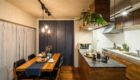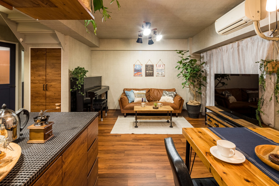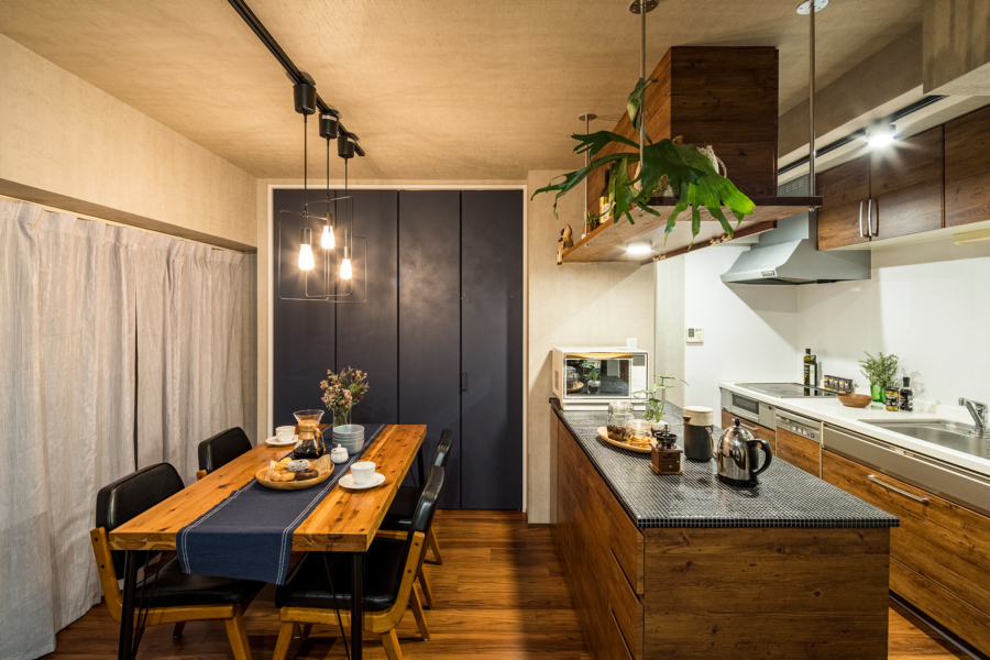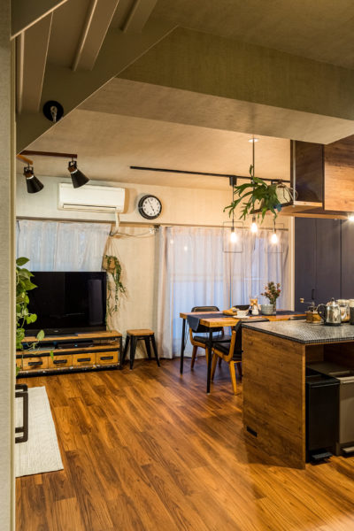コンパクトなLDKをどうやって広く動線よくするか。答えは廊下部分も部屋に取り込み、キッチンへのアクセスを良くすることでした。 インテリアのイメージとして、ウッディなビンテージモダンにするか、それまでの明るいホワイト系の床にあわせたインテリアにするかを悩まれていましたが、イメージ画像とお持ちの家具から温かみのあるビンテージスタイルに。カフェインテリアで楽しく賑やかな空間になりました。