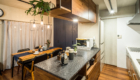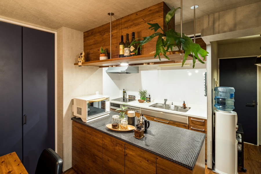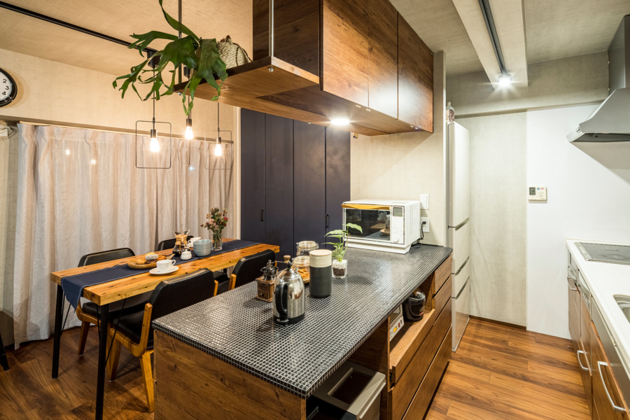 リビングダイニングに面するところに、アイランド型の両面収納カウンターを設置。黒のモザイクタイルが目を引きます。上部に設置した既製品の吊戸棚と既存のキッチンの扉には、カウンター収納と同じ柄の木目のダイノックシートを貼りました。キッチンへのアクセスが良くなり、カウンターを囲んで奥様が作業をしたり、お子様がお手伝いしたり、とできることが増えました。